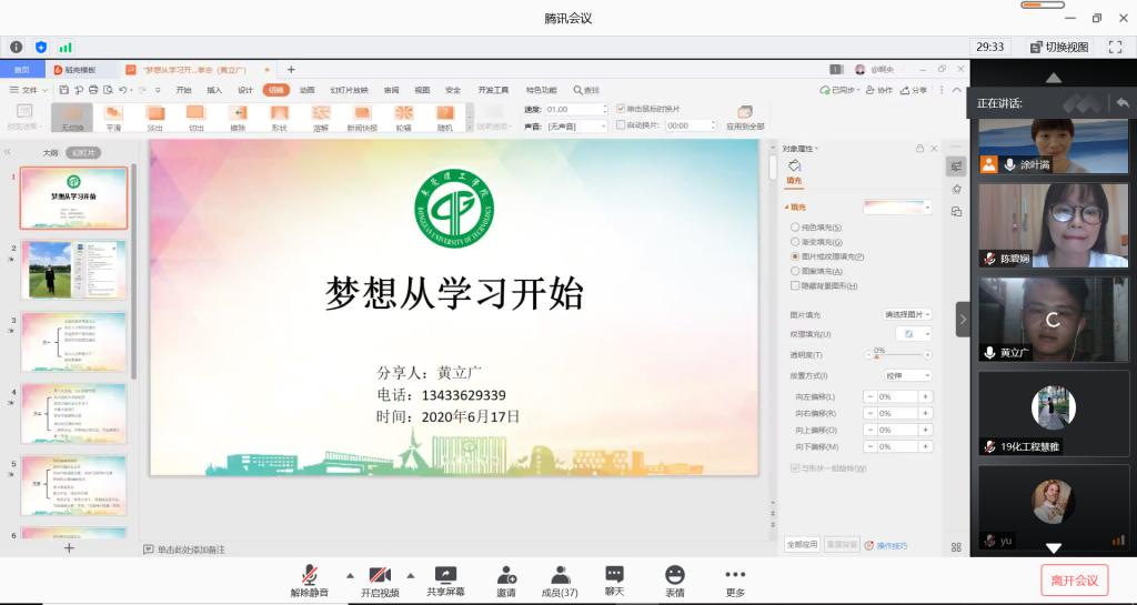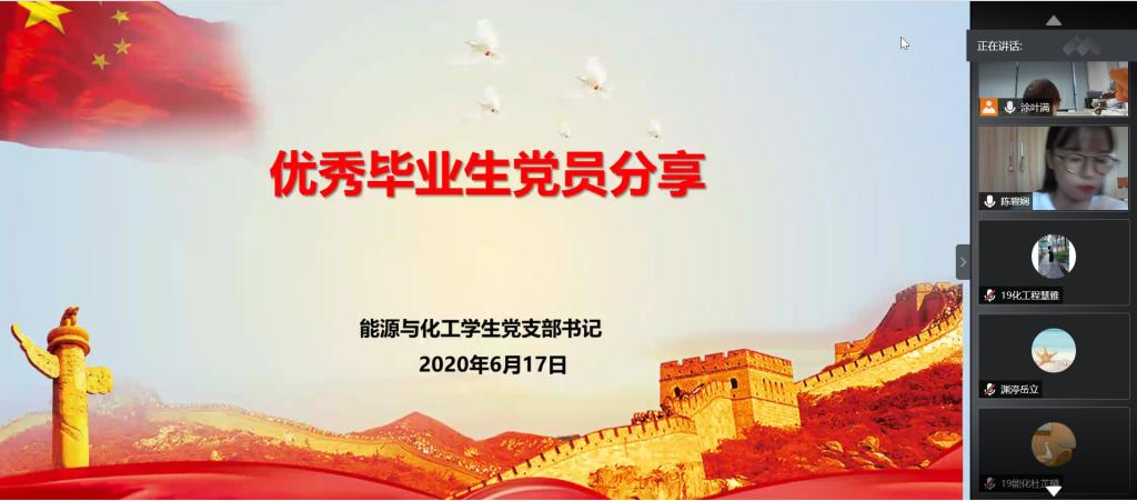 6月17日,sunbet申搏能源与化工学生党支部在腾讯会议上举行了优秀毕业生党员分享会。会上邀请了2020届优秀毕业生党员陈碧娴及黄立广,为第八期34名入党积极分子分享大学四年的奋斗足迹,会议由党支部书记涂叶满主持。