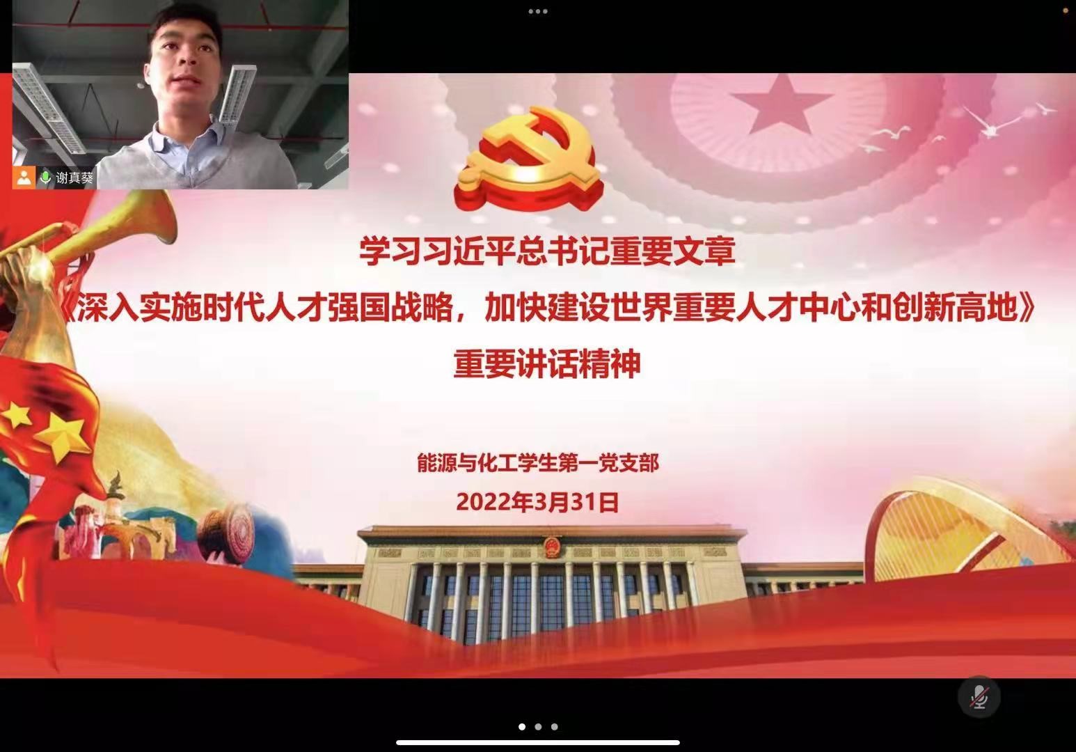 2022年3月31日下午4点,sunbet申搏能源与化工学生第一党支部在腾讯会议召开党支部会议,集中学习习近平总书记重要文章《深入实施新时代人才强国战略 加快建设世界重要人才中心和创新高地》,出席本次会议的有支部书记谢真葵、支部委员陈捷超、彭可文以及支部全体学生党员,会议由支部书记谢真葵同志主持。