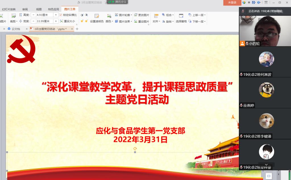 2022年3月31日sunbet申搏应化与食品学生第一党支部组织开展“深化课堂教学改革,提升课程思政质量”腾讯视频线上主题党日活动。活动由应化与食品学生第一党支部书记张博主持,支部党员参加此次活动。