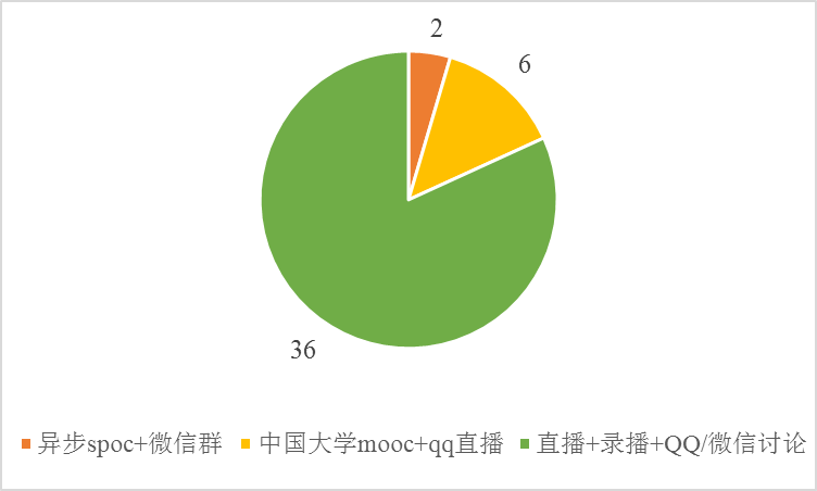 鼓励教师结合课程特色,通过多元化的教学方式进行线上教学,开设的课程中教学方式包括直播+录播+异步spoc+屏幕分享+QQ/微信讨论+优学院讨论等多样化的教学方式。据统计,36门课程采用直播+录播+QQ/微信讨论进行,6门采用中国大学mooc+qq直播,2门课程采用异步spoc+微信讨论,如下图2所示。从教师及学生反馈来看,目前所采用的在线教学方式均能被学生接受,特别是教学平台的线上视频资源+QQ/微信群讨论的方式更受学生欢迎,在线学习作业、测验布置方面及学习分析方面,教学平台具有明显优势,通过建立题库,不但简化了作业布置和批改,更便于成绩统计和分析。