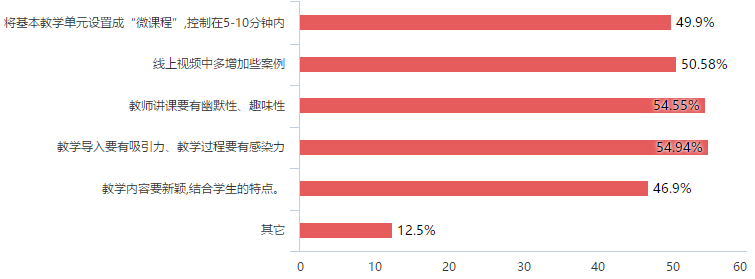 课题互动气氛还有待进一步提高。线上课程互动气氛调查结果显示(图19),气氛活跃、学生积极性高的课堂仅有41.47%,不到一半的占比,由此表明,老师们在授课过程中仍需要在启发学生思考、加强课堂互动性方面多下功夫,以便更好地提高学生参与课堂互动的积极性、主动性。从学生角度调查来看,提高课堂学习积极性可以从以下几方面作为着力点,包括教学导入要有吸引力、教学过程要有感染力,教师讲课要有幽默性、趣味性,线上视频中多增加些案例及将基本教学单元设置成“微课程”,控制在5-10分钟内。