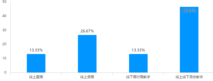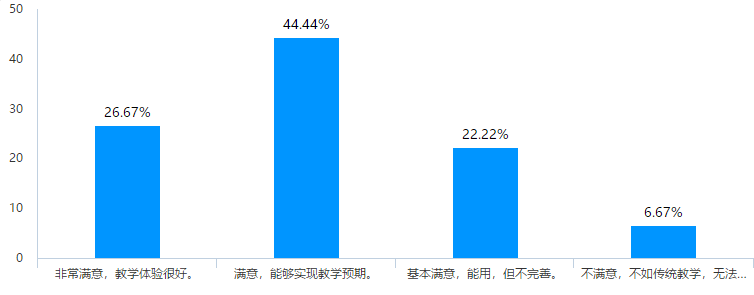 最后,对于线上教学满意度调查结果显示(图22),93.33%的教师认为线上教学基本能够满足教学要求,达到预期的教学目的,但教学平台如何实现教学多样化还需要不断的完善,尤其是是作业批改、考试、师生互动直播方面。