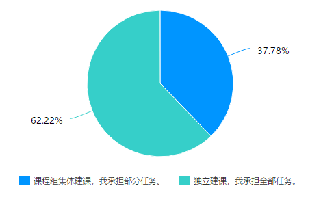 绝大部分教师能够熟练使用线上教学平台功能。调查显示,绝大部分受访教师对于在线教学平台的主要功能表示能够熟练使用。其中,“非常熟悉,经常使用”的选择率最高,占比55.56%,如图6所示。62.22%的课程由课程组集体建课(图7),此外,33.33%的教师已完成在线上教学平台的课程建设(图8)。