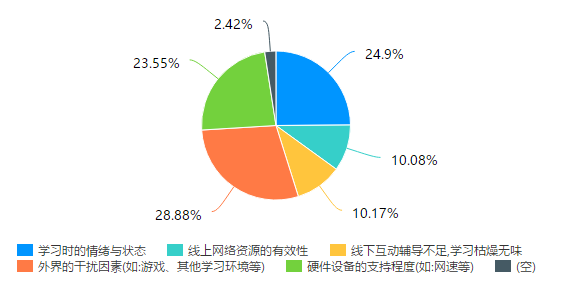 线上学习专注度和网络问题较为担忧。与传统的现场教学不同,受制于网络、技术、学习习惯及居家环境等问题的影响,很多学生表示对学习效果存在一定担忧。其中,71.03%的学生表示线上学习很容易分神。进一步调查发现,外界的干扰因素(如:游戏、其他学习环境等)是学生认为影响线上学习最大的因素,占比达到了28.88%;其次是学习时的情绪与状态和硬件设备的支持程度(如:网速等),占比分别达到了24.9%和23.55%。课后线下互动辅导不足,学习资源较为枯燥无味也是影响因素之一。