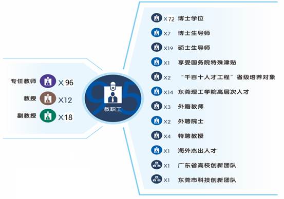 学院师资力量雄厚,现有教职工96人,具有博士学位72人,正副教授30人,另有双聘院士1人、特聘教授4人。建设有国家“中拉清洁能源与气候变化联合实验室”东莞基地,广东省分布式能源系统重点实验室、广东省高校创新团队、东莞市科技创新团队、省级工程技术研究中心、省级实验教学示范中心、东莞市重点实验室以及45个大学生校外实习基地。学院近年承担了国家“十三五”重点研发计划项目、国家自然科学基金项目等一批高层次科研项目,科研经费总额9000多万元。学院积极面向国家和广东省港珠澳大湾区区域经济建设发展需求,开展科学研究与技术服务,与国内高校、科研院所开展了紧密的学研合作,成果丰硕,为促进科技成果转化和地方经济建设的快速发展起到了积极作用。