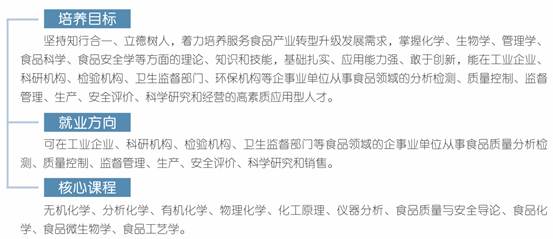 食品质量与安全专业充分借鉴我校作为教育部首批“卓越工程师教育培训计划”实施高校的培养模式,将学生发现问题、解决问题的能力作为培养核心;着力培养具有化学、生物学、食品工程、食品安全与营养、食品分析与检测等方面基本理论和基本技能,能在食品领域内从事食品生产技术管理、科学研究、产品开发、工程设计及食品质量与安全检测、控制、监督、执法、管理等方面工作的复合型高级工程技术人才。