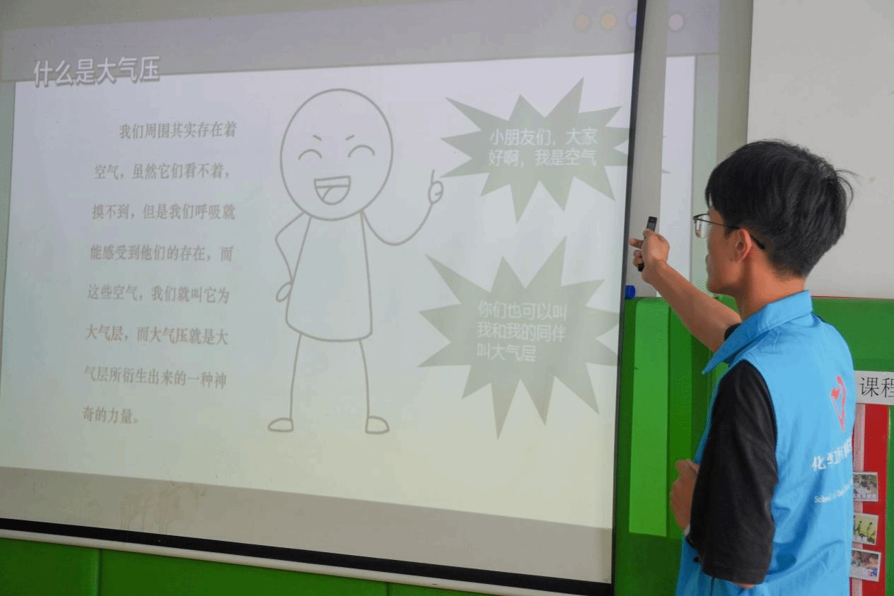 在小雨点儿童潜能开发中心多功能教室,一群孩子围坐在一起,流露出好奇的眼神。志愿者为小朋友们精心准备了两节科普课。在第一节课上,志愿者使用简单的材料制作了一个检验大气压存在的装置,向小朋友们展示大气压的“力量”。随后的科普课上,志愿者们利用生动有趣的视频讲解了水的毛细现象的科学原因。志愿者还与小朋友一起动手完成“大气压装置”与“水中绽放的纸花”两个小实验,引导他们领悟科学的魅力。