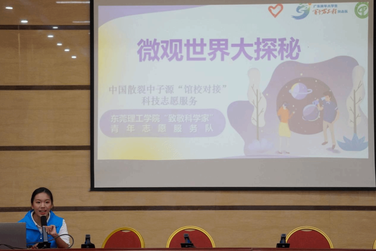 科普实验结束后,志愿者与小朋友们一起探究了微观世界,结合生活中随处可见的现象对微粒这一概念进行了解读,并向他们介绍了我国观察微粒的“秘密武器”——位于大朗镇的中国散裂中子源,志愿者用浅显易懂的语言、生动形象地比喻对中国散裂中子源这台“超级显微镜”是如何运转工作进行了讲解。