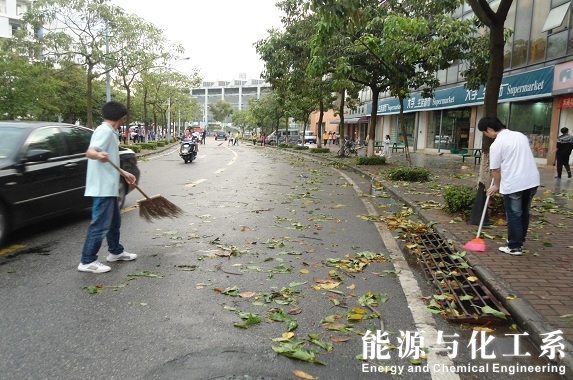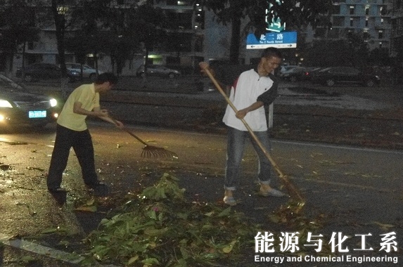 2012年3月20日一场突如其来的暴风雨给我们校园带来了破坏性的损害,树木被吹倒,冰雹击破了图书馆的玻璃,落叶满地,一片狼藉。这场暴风雨增加了环卫工人们的工作量。为了减轻他们的负担,也为建设美丽校园贡献一份力,在风雨过后晴朗的傍晚,能源与化工系志愿服务站与我系辅导员谢真葵老师组织全系学生在大学生活超市门前的一段交通要道开展了主题为“风雨同路,携手恢复美丽校园”的志愿活动。