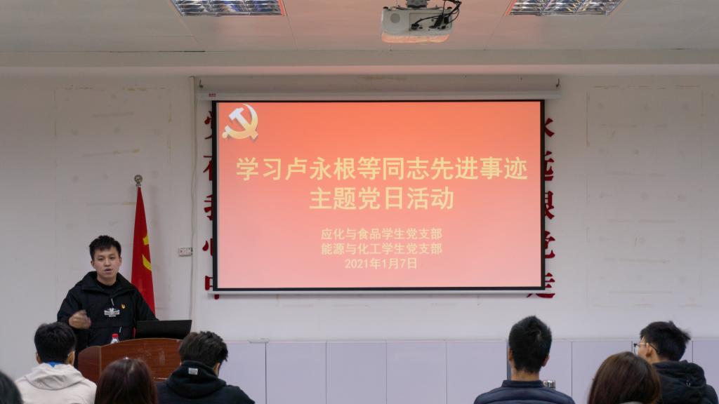 2021年1月7日下午,sunbet申搏应化与食品学生党支部、能源与化工学生党支部联合开展“学习卢永根等同志先进事迹”主题党日活动。辅导员曾祥龙老师和支部党员参加此次活动,活动由应化与食品学生党支部书记张博主持。