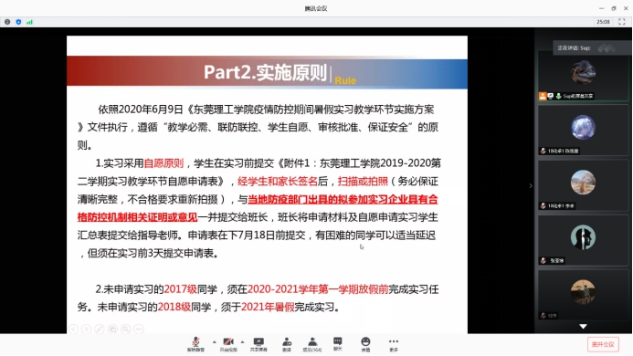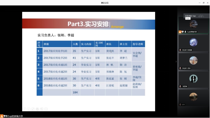 2020年7月9日下午,应用化学系通过腾讯会议线上平台召开学生暑期实习动员大会。本次实习包括2017级应化、化卓、2018级化卓等6个班级共184位同学,其中2018级的生产实习为4周时间,其它实习需1周完成。