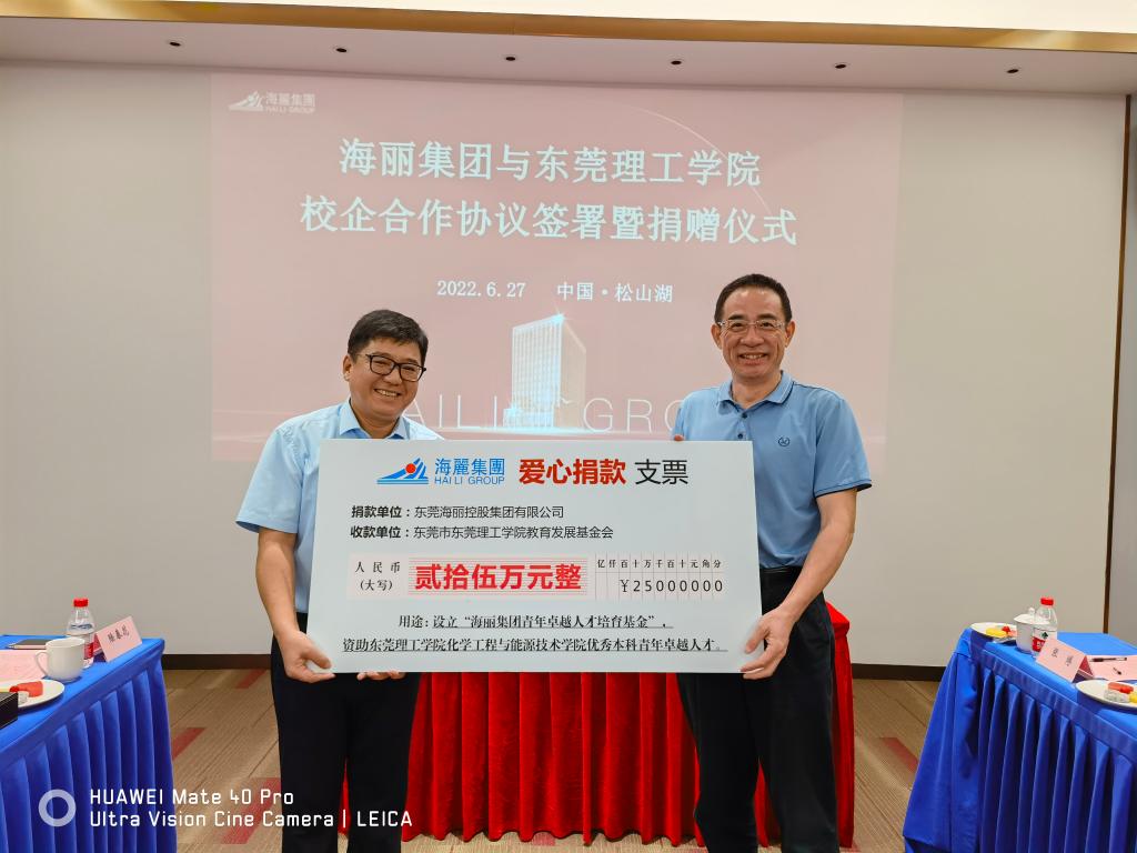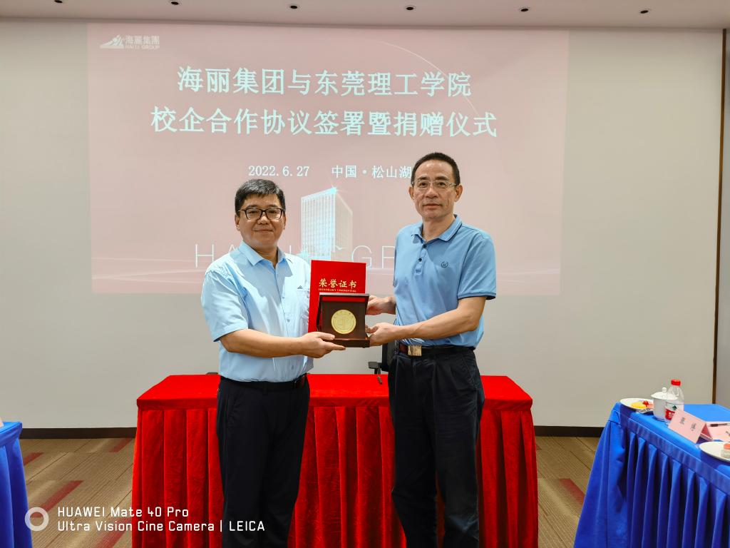 随后,在双方代表的共同见证下,举行捐赠签约仪式。为支持我校培养勇于担当、善于学习、敢于超越的高素质应用型创新人才,海丽集团向我校捐赠25万元用于设立“海丽集团青年卓越人才培育基金”,专门用于资助sunbet申搏,sunbet申搏培养优秀本科青年卓越人才。学校sunbet申搏党委书记兼院长徐勇军与海丽集团副总经理赵海红代表校企双方签署了捐赠协议。徐小军总经理向杨敏林副校长递送了捐赠支票,杨敏林副校长代表学校向徐小军总经理颁授捐赠荣誉证书并回赠纪念品。
