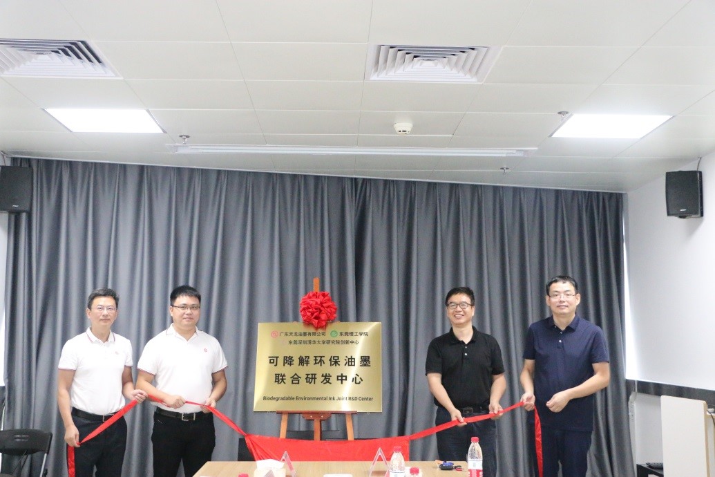 2021年8月20日上午,由广东天龙油墨有限公司、东莞理工学院、清华东莞创新中心共同组建的“可降解环保油墨联合研发中心”揭牌仪式在东莞理工科技创新研究院举行。sunbet申搏院长徐勇军,广东天龙油墨有限公司总经理蔡威、副总经理王纲,清华东莞创新中心副主任邬新国共同为可降解环保油墨联合研发中心揭牌。