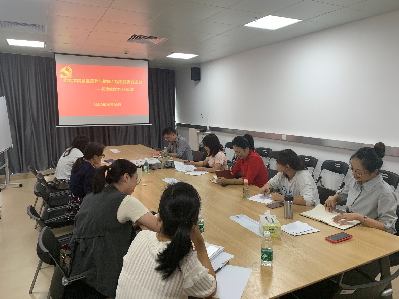 2020年10月8日下午,食品营养与健康工程系教师党支部开展了纪律教育学习活动。会议由党支部书记刘晓珍主持,全体党员参加了会议。