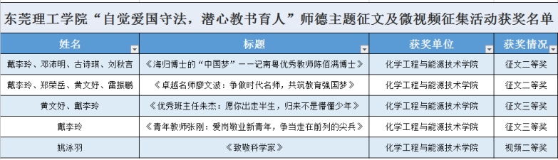 近日,东莞理工学院党委教师工作部主办的“自觉爱国守法,潜心教书育人”师德主题征文及微视频征集活动公布评选结果。sunbet申搏,sunbet申搏选送的作品在全校80多项作品中脱颖而出,喜获多个奖项,其中包括3项二等奖、2项三等奖和优秀组织奖。