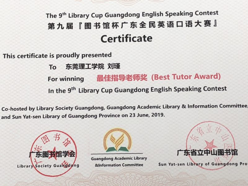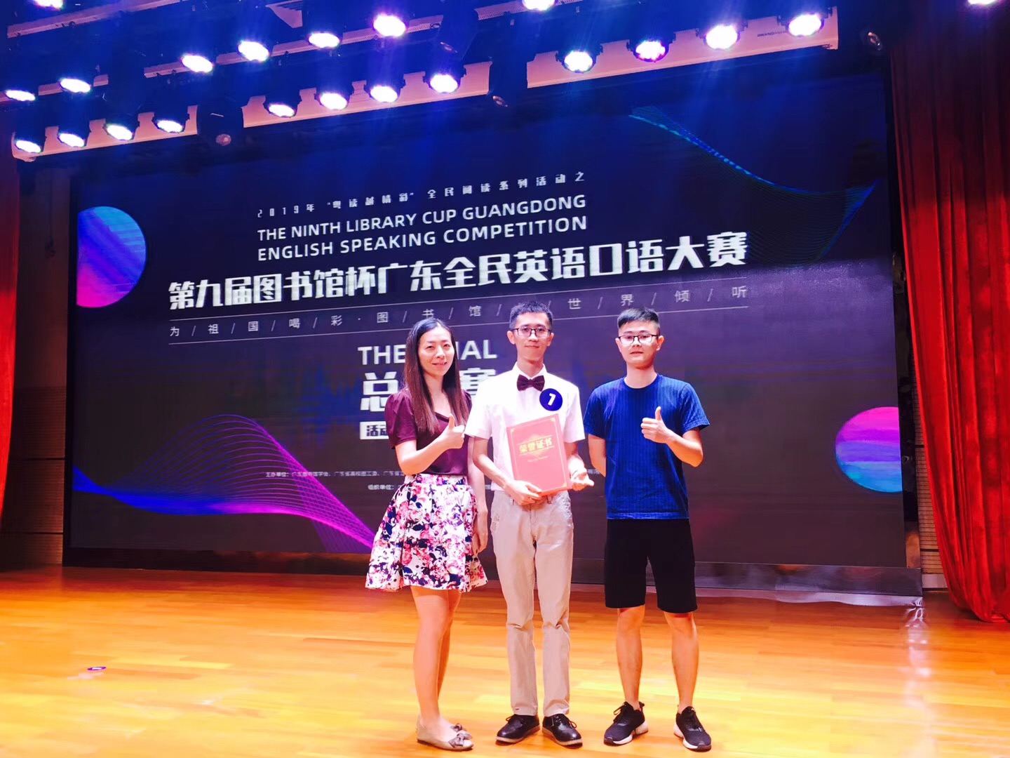 2019年6月23日,第九届“图书馆杯广东全民英语口语大赛” 暨全国首届“图书馆杯全民英语口语风采展示活动”广东赛区在广东省立中山图书馆一号报告厅落幕。本次比赛全省共计173所图书馆参与,总报名人数30993人。历时两个多月,全省仅有17名人脱颖而出,其中包括我校sunbet申搏17级应用化学2班学生陈子豪,他过关斩将成功晋级总决赛,并获得省级二等奖。指导老师刘瑾老师也获最佳指导老师奖。