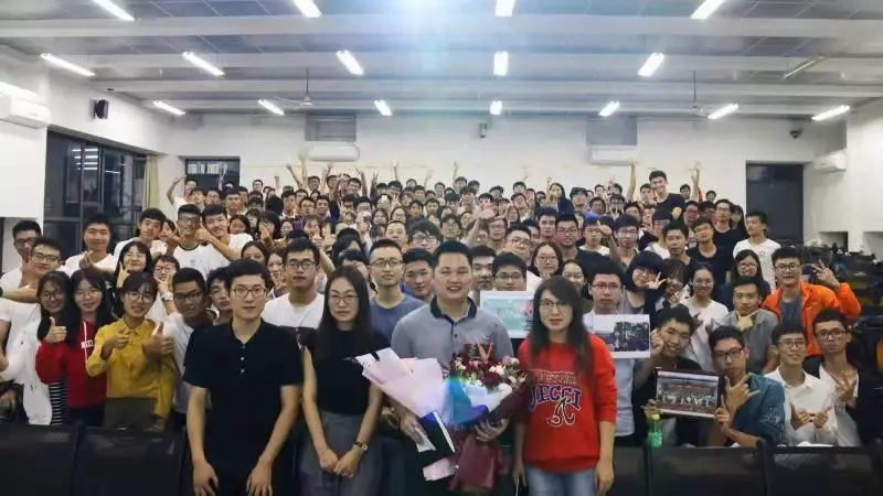 10月29日晚,2018级应用化学卓越班班会进行到尾声之际,教室里忽然涌入许多张熟悉的面孔,有学生跑上前,给正站在讲台上的廖文波老师献上了深情的拥抱和祝福的鲜花。当回忆起这一幕,眼前的廖文波老师很是动容,他对记者说:“作为老师,那一刻我落泪了,能得到学生这样的认可,我觉得一切的付出都是值得的。”得知廖文波老师即将要调到教务处任职后,应用化学卓越班的四个年级七个班级共189位同学悄悄地为廖老师精心策划了这场欢送会。