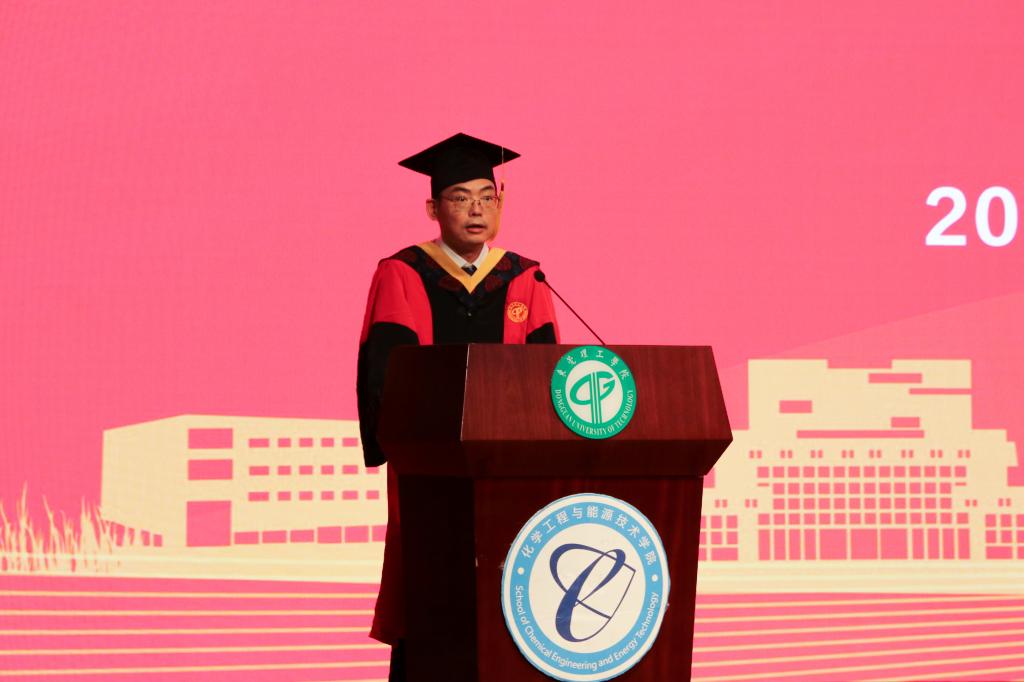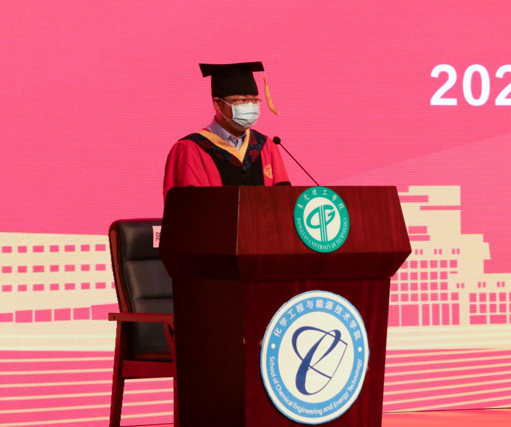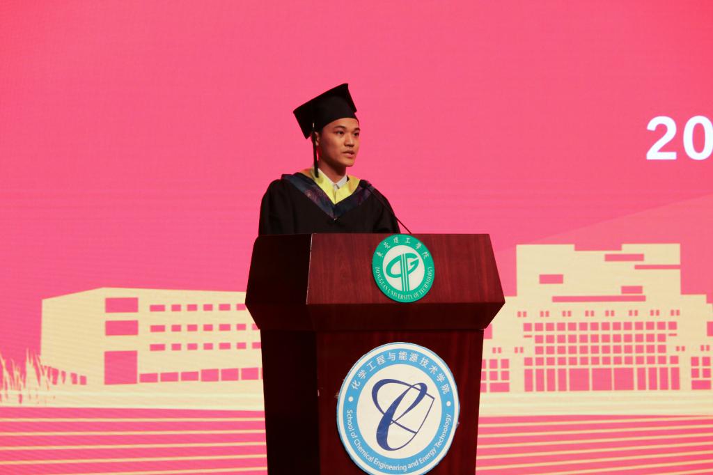 在毕业生代表发言环节,18化工1班学生李世德表示,他非常感激在四年大学生活里老师的谆谆教诲与同学们的互助相伴。祝愿在毕业后,同学们能不负母校期望,在各自的人生道路上努力拼搏、砥砺前行,创造出属于自己的“蔚蓝星空”!
