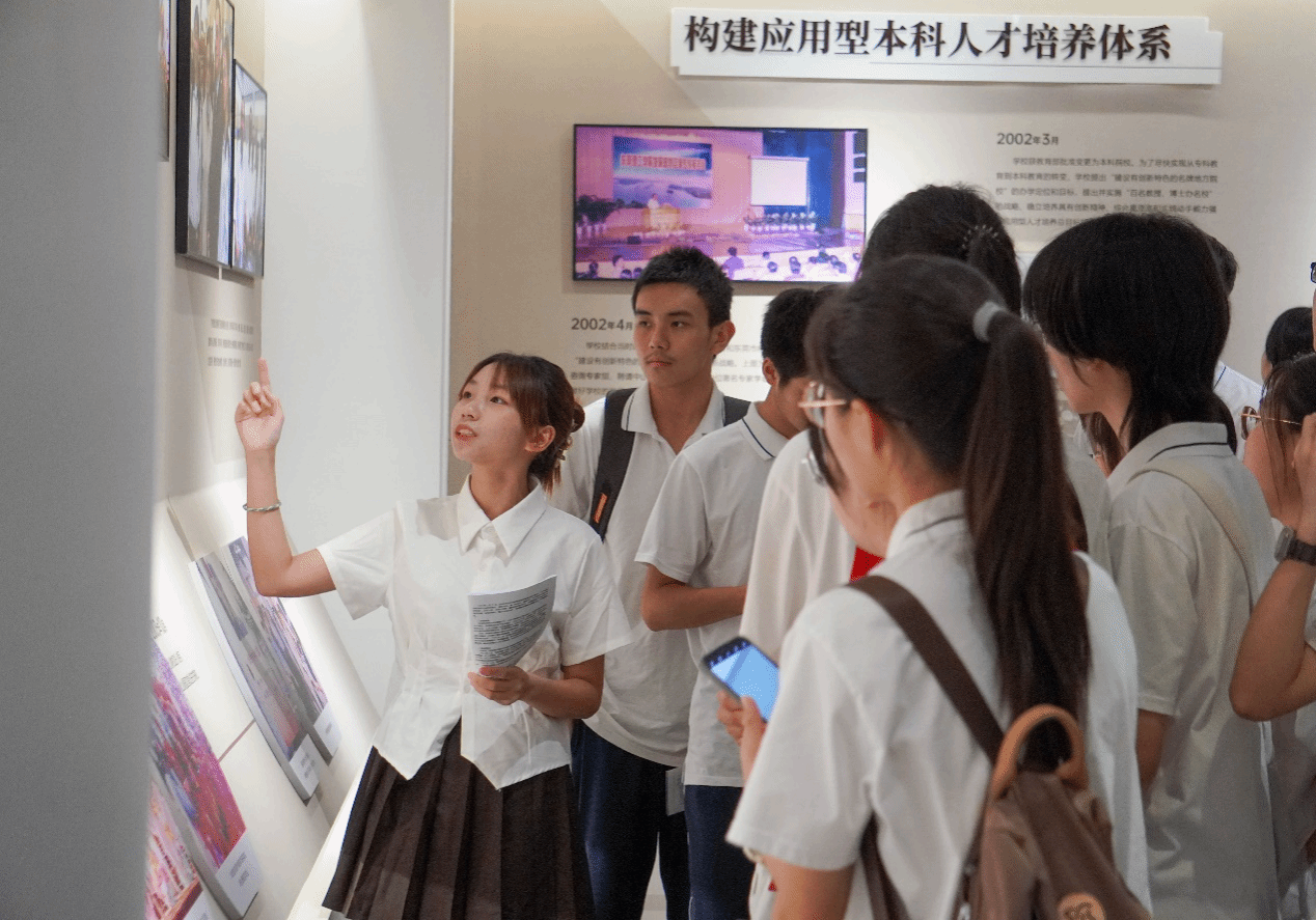 随后,桂山中学的老师和同学们共同参观了校史展览厅与杨振宁教研楼;在学生讲解员的介绍下,大家对东莞理工学院的建校历程有了一定的了解,厅内主要事件的图文展板也使学生们更深入地了解到东莞理工学院的历史和文化积淀。